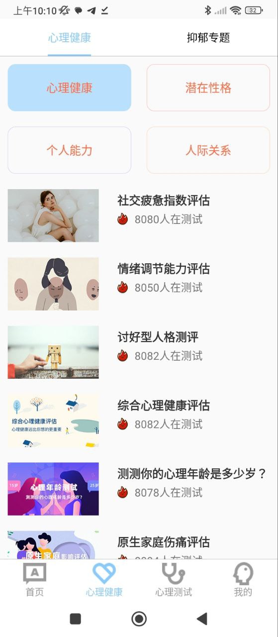 该应用专为18-45岁受情绪问题困扰的年轻人设计,尤其适合高压职场人、学生群体以及关注心理健康的普通用户。它通过标准化测试题库(如PHQ-9、GAD-7等国际通用量表)、即时分析报告和个性化建议,打破传统心理咨询的时空限制,让用户以零门槛方式获得初步心理状态筛查。